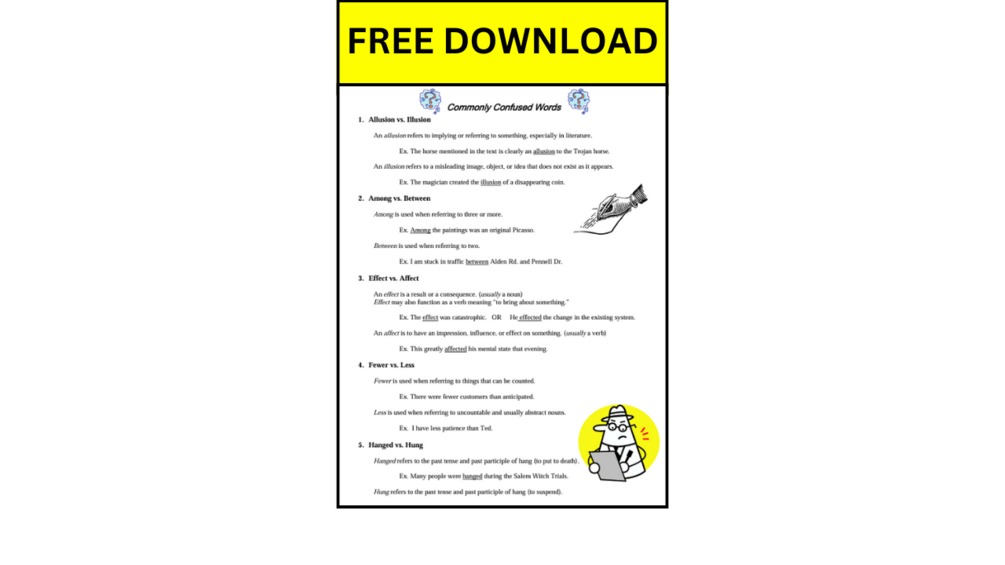Ever mix up "affect" and "effect"? You're not alone! This 5-page FREE PDF breaks down commonly confused words in American English. Learn the difference between "there," "they're," and "their," master tricky verb pairs like "lie" and "lay," and finally conquer those pesky homophones. Also included is a 'Commonly Confused Word Practice Exercise' with the answers.